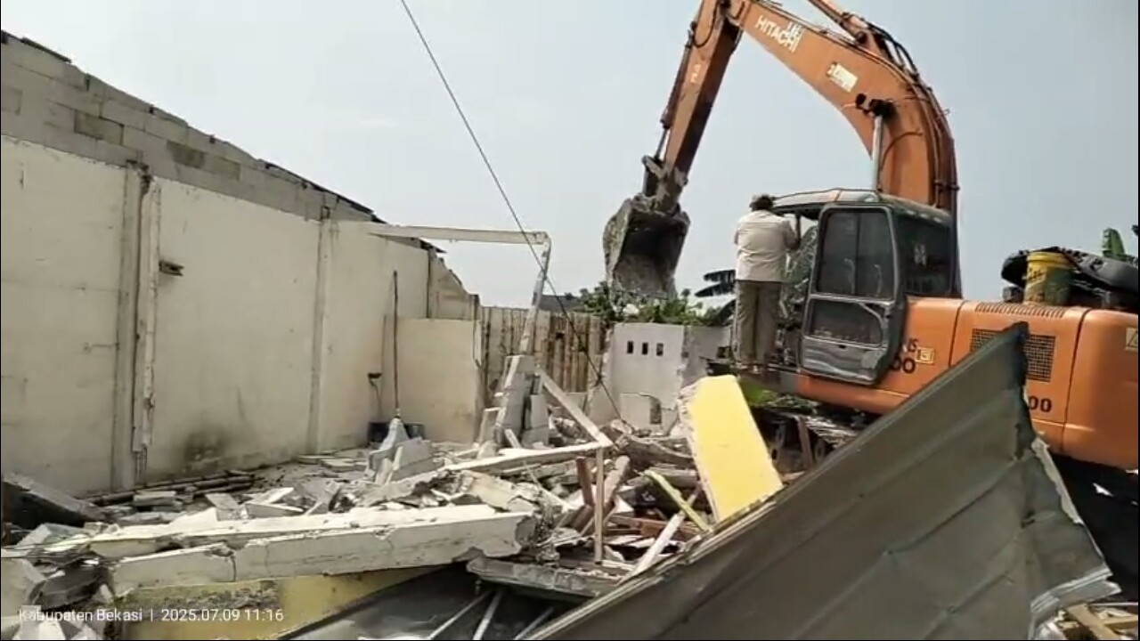 Kali ini, pembongkaran terhadap ratusan bangunan liar dilakukan di bantaran Kali Jalan Pulo Timaha, Kecamatan Babelan, Kabupaten Bekasi, Rabu(9/7/2025).