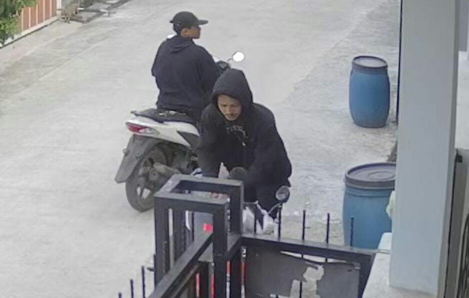 Dalam rekaman CCTV, terlihat dua orang lelaki memakai pakaian warna hitam berboncengan sepeda motor jenis matic berhenti didepan rumah warga.